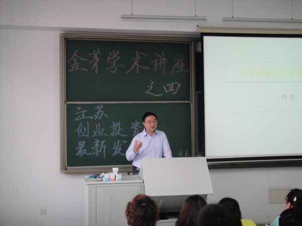 周勇博士从创业投资的定义、创业投资在中国、创业投资在江苏、创业投资的实践等四个方面介绍了创业投资的定义、特点以及在中国和江苏的发展状况。周勇博士又从创业投资在江苏省的总体情况、资金来源、机构分布、投资情况、退出情况等五个方面详细介绍了江苏省风险投资的发展。最后,周勇博士以江苏省苏豪控股集团有限公司为例分析了我国创业投资的实践并分别列举了风险投资在经济发展的三个不同阶段的具体实例。