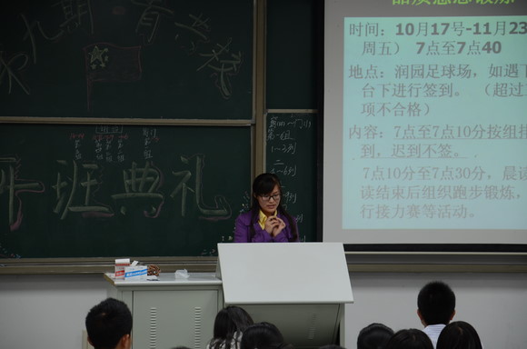 随后主持人详细说明了本期青共校丰富多彩的内容安排以及考勤制度和评分细则。本次青共校除基本的课程之外还有晨跑晨读,“在我的歌声里”唱红歌,趣味读书小组等活动,既丰富了学员的学习生活也提高了学员的学习积极性。同时,严格的评分制度也为同学们提供了自我规范的标准。