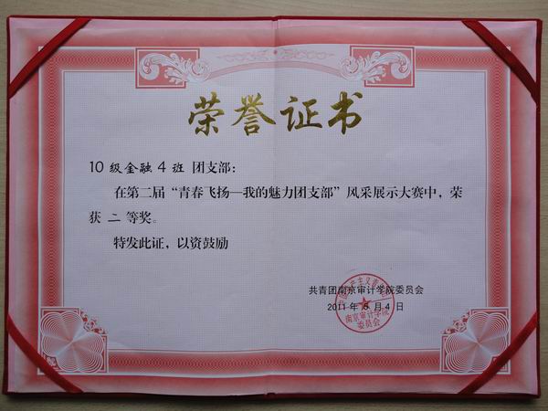 5月4日下午,南京审计学院第二届五四表彰大会暨“我的魅力团支部”风采大赛在金审体育馆隆重拉开大幕,2010级金融4班作为唯一一个进入决赛的2010级和唯一一个直播色情 参赛队伍,以总分第四的优异成绩,勇夺本次比赛的二等奖。