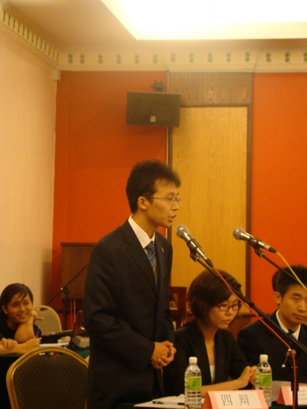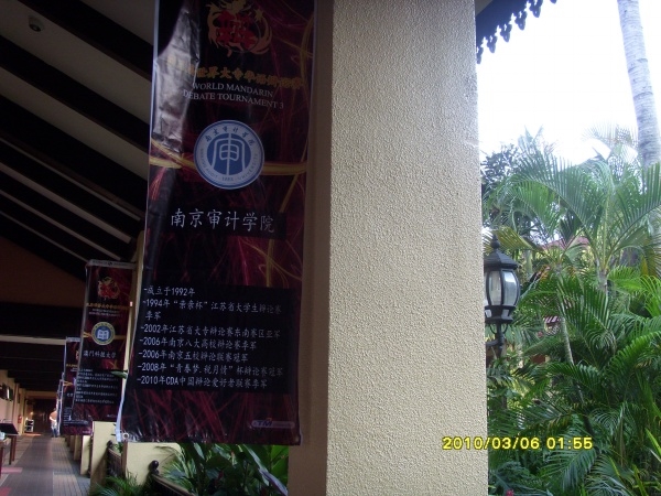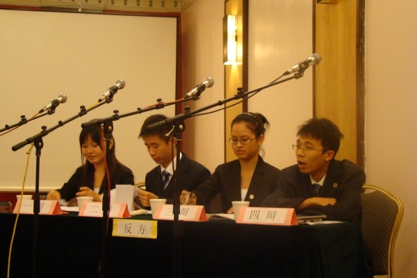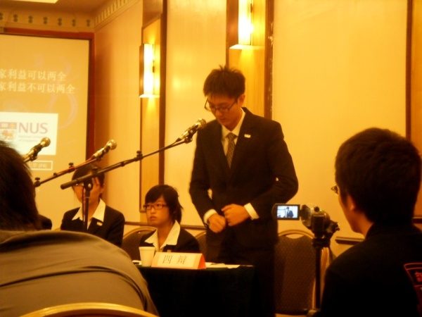 第一次参加国际性比赛,不管对于南审,还是对于我们队友和我个人,都是一次全新的征途,出发的时候,说实话,我心里并没有底,不知道和类似于新加坡国立大学这样的强手过招,会是怎样的结局,相当忐忑,甚至曾经说过“小组赛能拿下一场便是胜利”这种没志气的话。直到险胜第一场,进而大胜第二场,小组提前出线时,才算放下心来。接下来的比赛,彻底放开一切束缚地驰骋,那种感觉真的很好。记得那时和自己的战友们在一起彻夜讨论、逐点推敲,往往要到深夜一两点才睡,虽然很辛苦,但心里是很快乐的,有一种创业中才有的朝气与成就感。直到杀入八强,我们这群纯大二学生面对着淘汰上届世辩冠军的重庆大学研究生军团,还记得当时我们队长郭玲君学姐的叮咛:“不管多不利,放开打,气势上不能输。”颇有一番风萧萧兮易水寒的悲壮。初上场时其实是很紧张的,一下子就喝光了一瓶水。可突然之间想到了自己一路走来的点点滴滴,想起刚入队时学长学姐们的热情鼓励、想起两年中的往来厮杀、想起当年首战新加坡即使体力不支依然作完四辩稿、想起并肩作战中战友们的深厚情谊,望着PPT上南审的校徽凝神思索,都到这一步还有什么好紧张呢?那场比赛自己觉得打得真是酣畅淋漓,虽然现在回头来看还有很多缺陷,但至少问心无愧的是,自己的确把状态调整到了最佳。最后,也很荣幸,评委们授予了我我这场比赛的最佳辩手,但我们仍以8.5比12.5的微弱劣势告负,实力的原因有很多,但的确自己觉得从中获得了成长,如果有下次,相信我们会打得更好,走得更远。