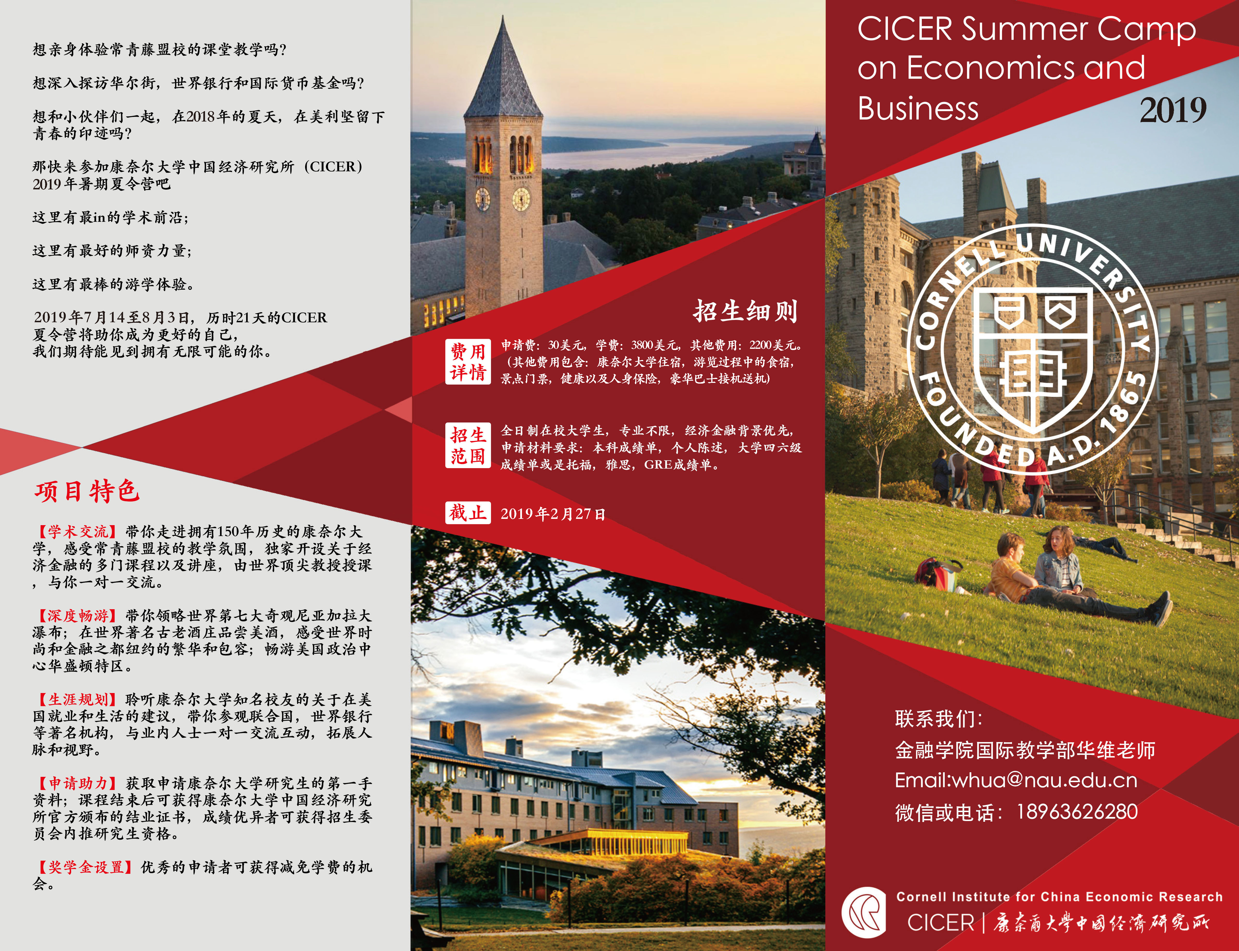 拟选拔10名优秀本科生于2019年暑期(7月14日至8月3日)前往美国康奈尔大学进行为期21天的夏令营活动,具体包括学术交流、深度畅游、生涯规划、申请助力等。