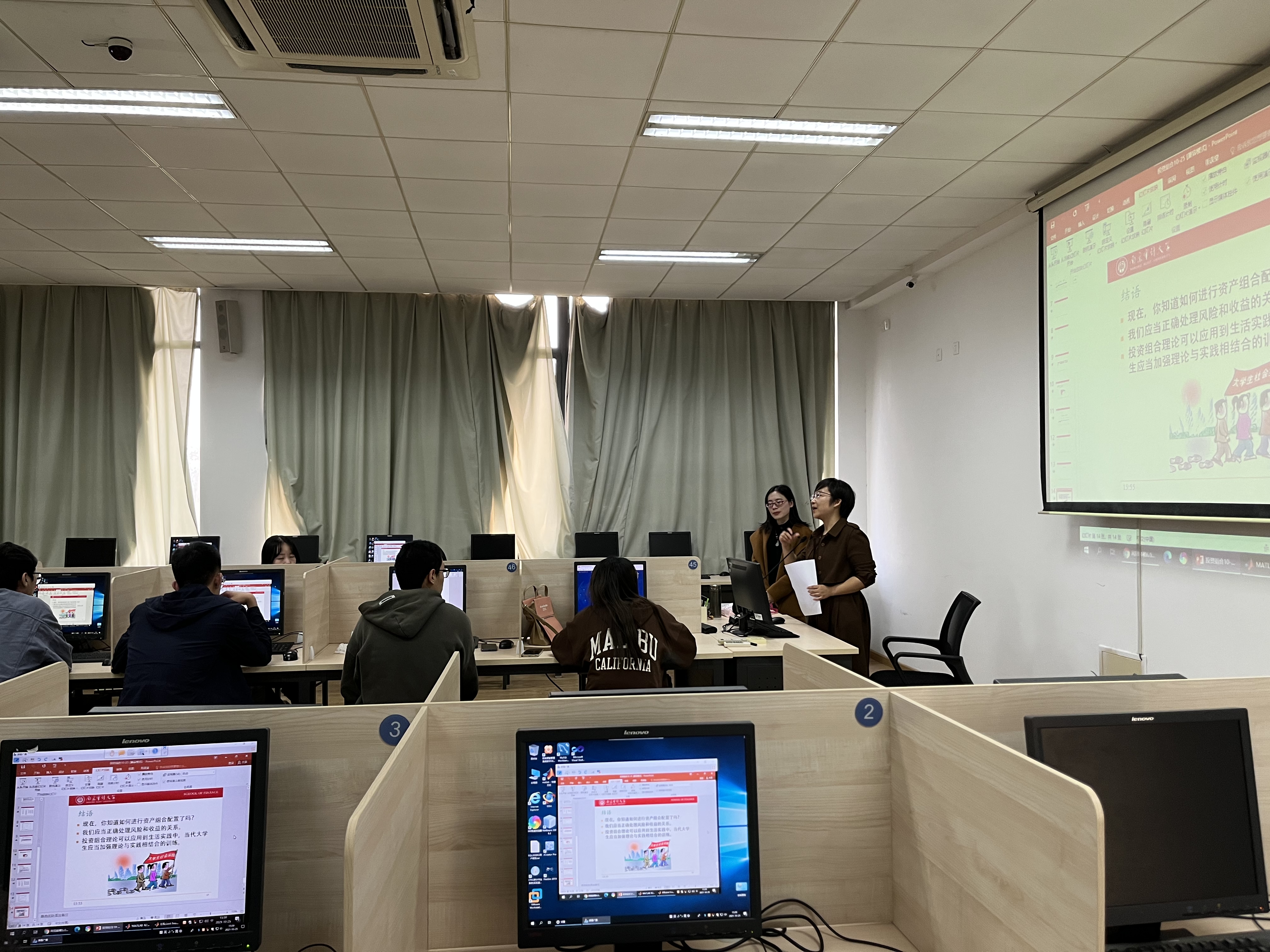 2021年10月25日下午,直播色情 组织教师在竟秀楼南楼s302机房集体观摩金融工程系邢钰老师的“Matlab与金融建模”课程,刘妍副院长、学院教务办和8位学院教师参加。邢老师精神饱满,授课思路清晰,采用案例分析等方法,并适度拓展,师生互动频繁,课堂气氛活跃,授课效果良好。学院姜勇、李杰老师和邢老师就课堂教学进行交流,刘妍副院长进行点评。