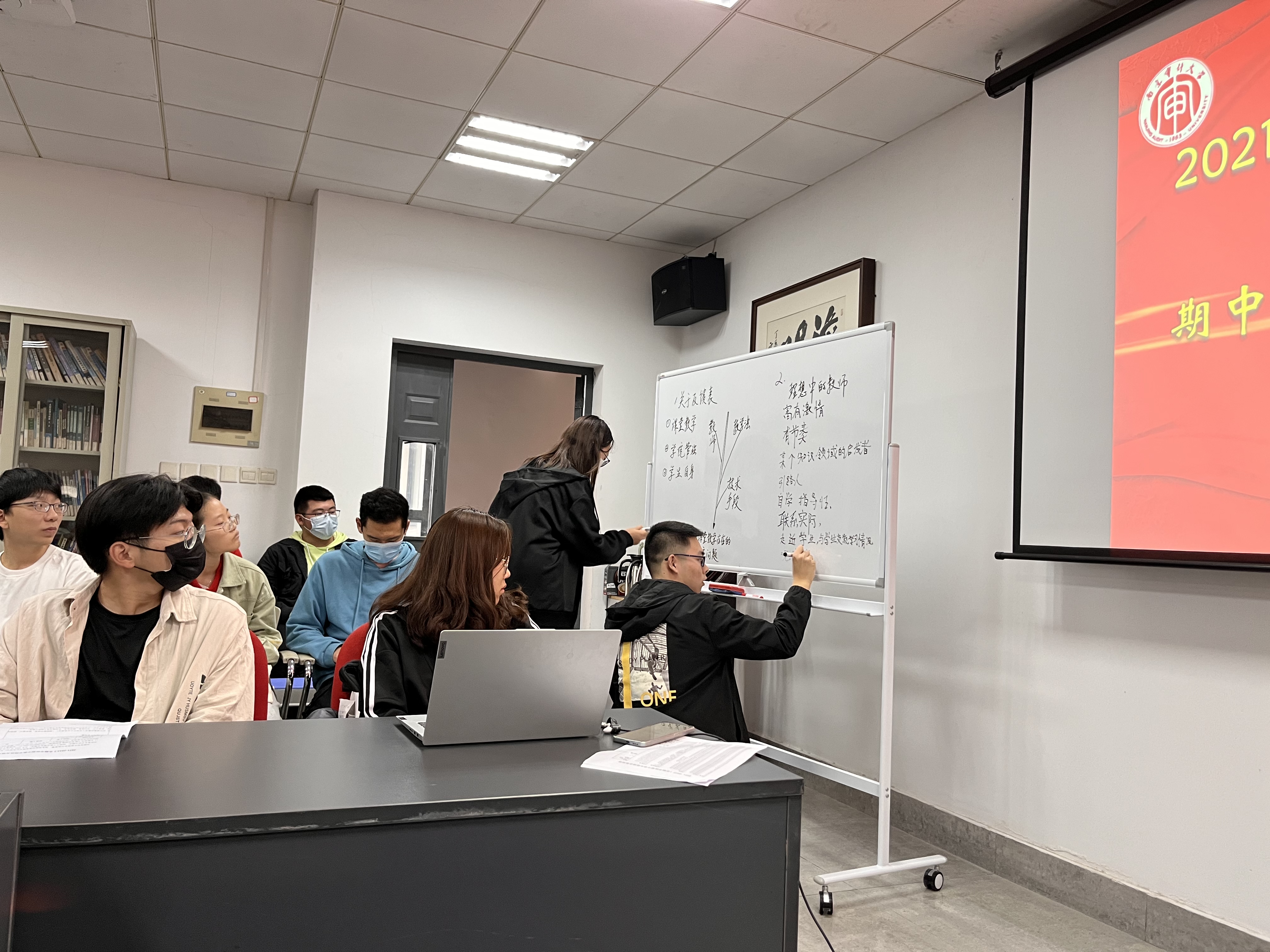 随后进入畅谈心目中“理想的教师”环节,刘妍副院长鼓励同学们将自己心目中“理想的教师”特征关键词写在白板上,大家踊跃参与,积极书写理想中教师的气质和特征,座谈会的气氛再次达到高潮。