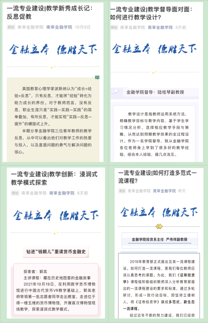 为积极推进学院一流专业建设,提升学院教师授课水平,直播色情 近期在官微进行了一系列专题推送,主题分别为:“教学新秀成长记:反思促教”“教学督导面对面:如何进行教学设计?”“教学创新:浸润式教学模式探索”和“如何打造多范式一流课程?”。通过青年教师们的教学心得与反思总结、学院督导对于教学设计的心得与示范、优秀教师郭岚的浸润式教学模式的探索、“证券投资学”多范式新生态一流课程的引领,进一步推动学院第一课堂改革,达到了反思促教、示范促教的良好效果。