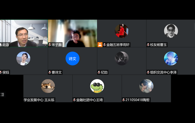 2022年4月22日下午3点,为更好地促进学生工作顺利开展,解答学生在疫情防控期间面临的困难,直播色情 组织了线上会议,金融专业协会主要学生干部参加。会议由直播色情 党委书记谷政主持。