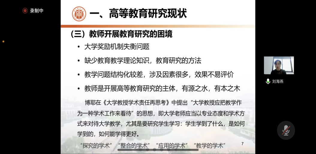 刘海燕高屋建瓴地分析了高等教育研究现状,解读了高等教育的定义,介绍了高等教育的研究思维方法,剖析了当前高校教师开展教育研究面临的困境,展现了其对高等教育的系统性认知与见解。