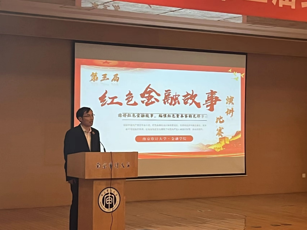 谷政书记为活动致辞。他带领同学们回顾了中国金融业发展的历程和百年间无数金融革命斗士的光辉事迹。指出本次活动的初心,就是让青年学子们缅怀红色金融史,追忆峥嵘岁月,用激情演讲的方式彰显南审青年的新时代精神。