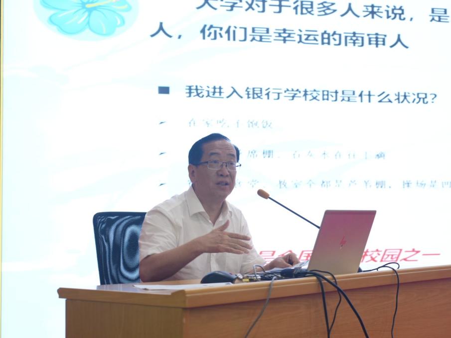 胡庆华校友深情回忆了自己当年在芦席棚搭建的教室中艰苦求学的岁月,感慨时代变迁和今日学习条件的优越,勉励同学们珍惜当下。他以“我们是最幸运的一代银行人”为引,回顾了中国金融业自改革开放以来波澜壮阔的发展史。从1978年全国仅有一家银行(中国人民银行),到如今银行业机构数量、从业人员、资产规模均实现跨越式增长,他用详实的数据和生动的案例向新生们展示了中国如何成为一个金融大国,成绩来之不易。同时,他客观分析了当前金融发展的形势,并强调金融业永远是一个好的行业,从事金融业仍然是一个好的选择,金融人仍然大有可为,任重道远。他结合2023年中央金融工作会议精神,强调了“加快建设金融强国”的战略目标以及金融业服务实体经济、防控风险、推进金融开放等重要使命。
