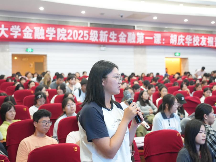 面对台下对未来充满憧憬的新生,胡庆华校友抛出了“什么样的人生,才是成功的人生?”这一深刻问题。他指出,大学四年,不仅是系统学习专业知识的阶段,更是培养适应社会核心能力的关键时期。他勉励广大新生既要胸怀远大的理想,也要保持脚踏实地的作风;既要修炼积极阳光的性格,也要锻造勇往直前、不留遗憾的勇气和魄力。胡庆华校友指出:每一代人都有每一代人的机会,每一代人都有每一代人的责任,每一代人都有每一代人的使命;他寄语新一代金融人:要将个人奋斗的涓涓细流,主动融入国家发展的浩荡江河,勇担时代赋予的历史使命,在建设金融强国的宏伟征程中,成就一番大有作为的事业。