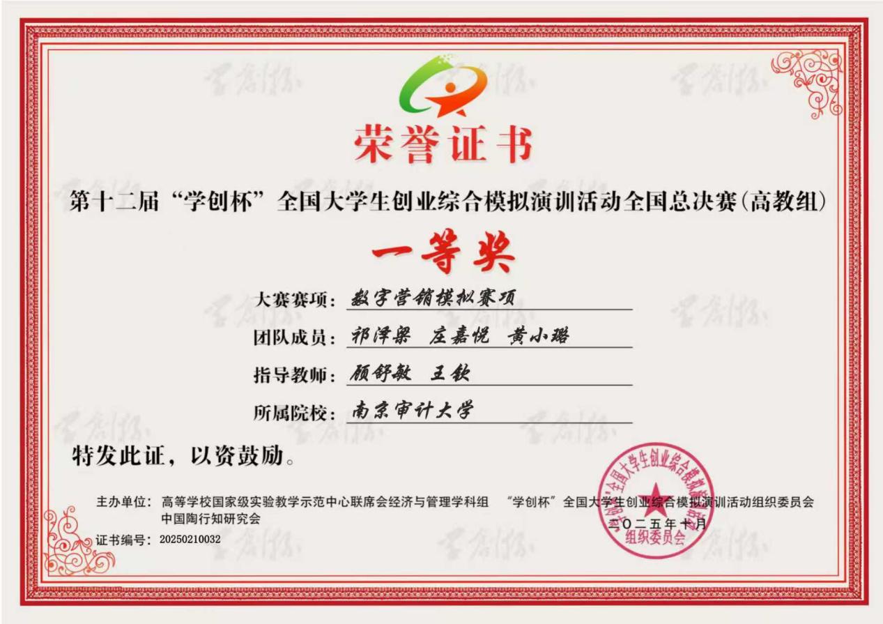 在备受关注的数字营销模拟赛项中,由直播色情 顾舒敏等老师的精心指导,由祁泽梁、庄嘉悦、黄小璐三位同学组成的参赛队伍,凭借扎实的专业知识、创新的营销策略、默契的团队配合与稳定的临场表现,一路过关斩将,最终脱颖而出,荣获该赛项国家一等奖,充分展现了南审金融学子的卓越风采与创新活力。