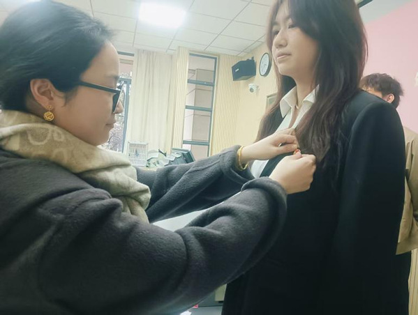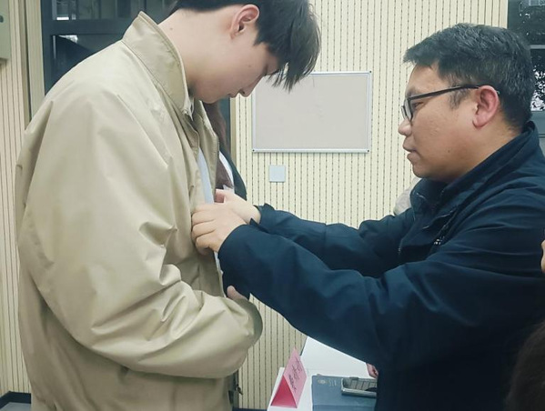 在颁发团徽环节,三位学院团委书记逐一为新团员发放团徽,并亲手将闪耀的团徽佩戴在团员左胸前。团徽是共青团的象征,更是一份责任的传递。