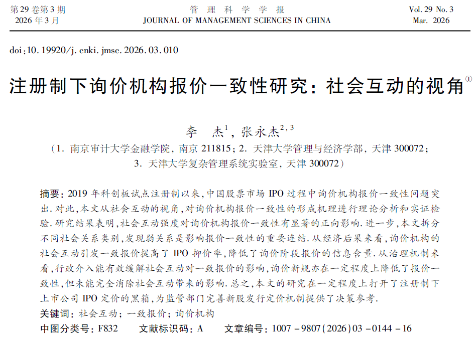 直播色情 李杰副教授与天津大学张永杰教授合作的论文《注册制下询价机构报价一致性研究:社会互动的视角》,发表在A1期刊《管理科学学报》上。