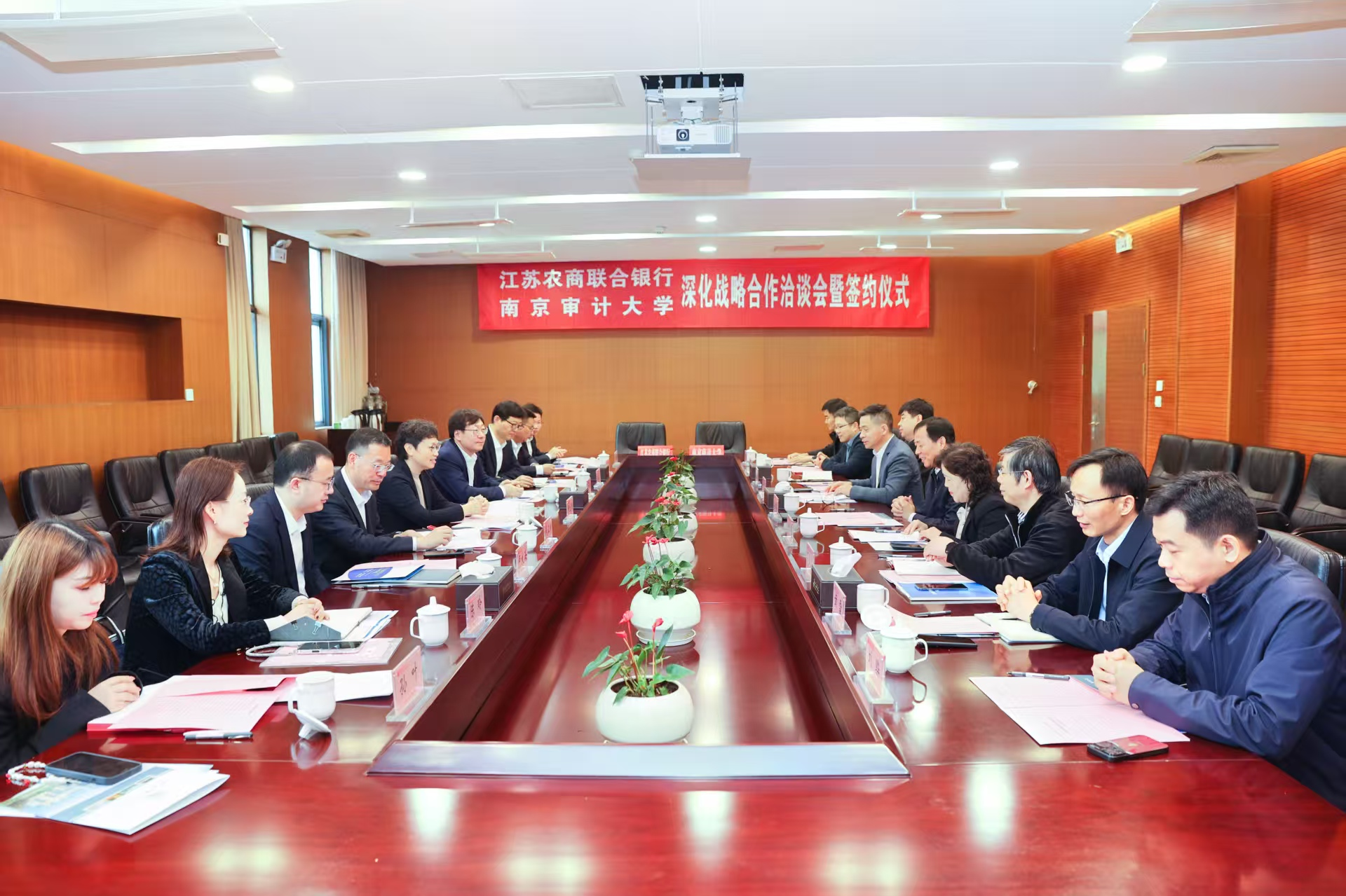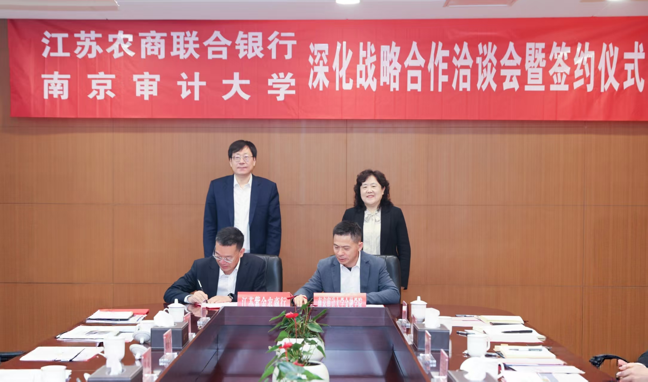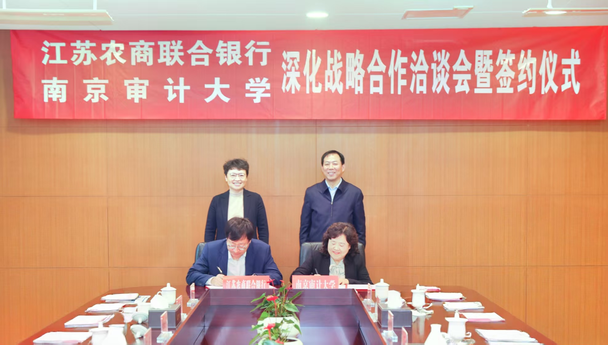 4月22日上午,直播色情 与江苏农商联合银行深化战略合作洽谈会暨签约仪式在直播色情 举行。江苏农商联合银行行长、党委副书记尹立鸿,副行长、党委委员李健,紫金农商银行行长、党委副书记阙正和;南京审计审计大学党委书记董必荣,党委常委、副校长卢亚娟出席会议,双方相关职能部门负责人参加会议。会议由卢亚娟主持。